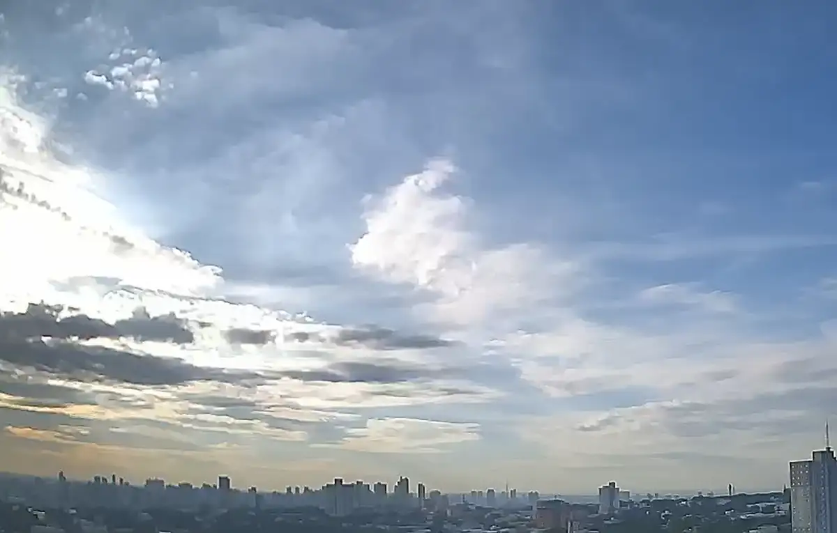 O Simepar prevê dia de céu claro, com temperatura máxima de 32˚C, sem chuva, umidade relativa entre 35% e 85% e pôr do sol às 18h08. Para amanhã, a previsão é de tempo parcialmente nublado com pancadas de chuva.