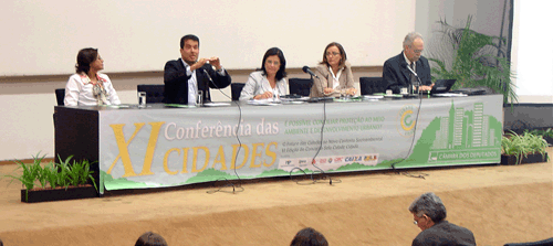 A professora Ana Lúcia Rodrigues, do Observatório das Cidades (UEM), participa de painel na XI Conferência das Cidades, que acontece no Auditório Nereu Ramos, no Congresso Nacional, em Brasília. Um dos integrantes da mesa é André Trigueiro, professor da PUC do Rio, mas conhecido mesmo como apresentador do canal GloboNews.