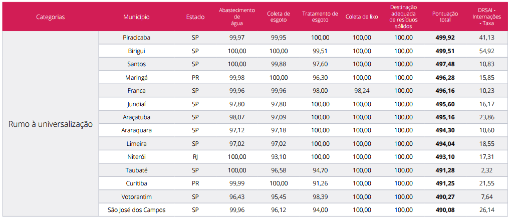 A cidade faz parte das 14 que têm pontuação acima de 489, classificação “rumo à universalização” do saneamento básico. Maringá tem pontuação total de 496,28, resultado de 99,98% de abastecimento de água, 100% de coleta de esgoto e 96,30% de tratamento de esgoto. Piracicaba (SP) está em primeiro lugar no ranking nacional. Do Paraná, além de Maringá aparece Curitiba, em 12º lugar.