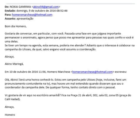 Em 9/10/2016 mandei a seguinte mensagem ao Rigon: ‘Tem o email do Homero Marquese? Tem trocando opinião com ele sobre a campanha? Se tiver me passe, que quero passar algumas coisas que penso.’ E ele me respondeu: ‘homeromarchese@hotmail.com Tenho falado com ele sim’.