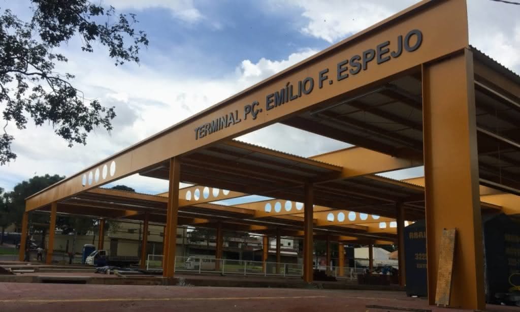 Na praça Emílio Espejo, cruzamento das avenidas Kakogawa e Américo Belay, zona norte de Maringá, o futuro terminal começa a receber a cobertura.