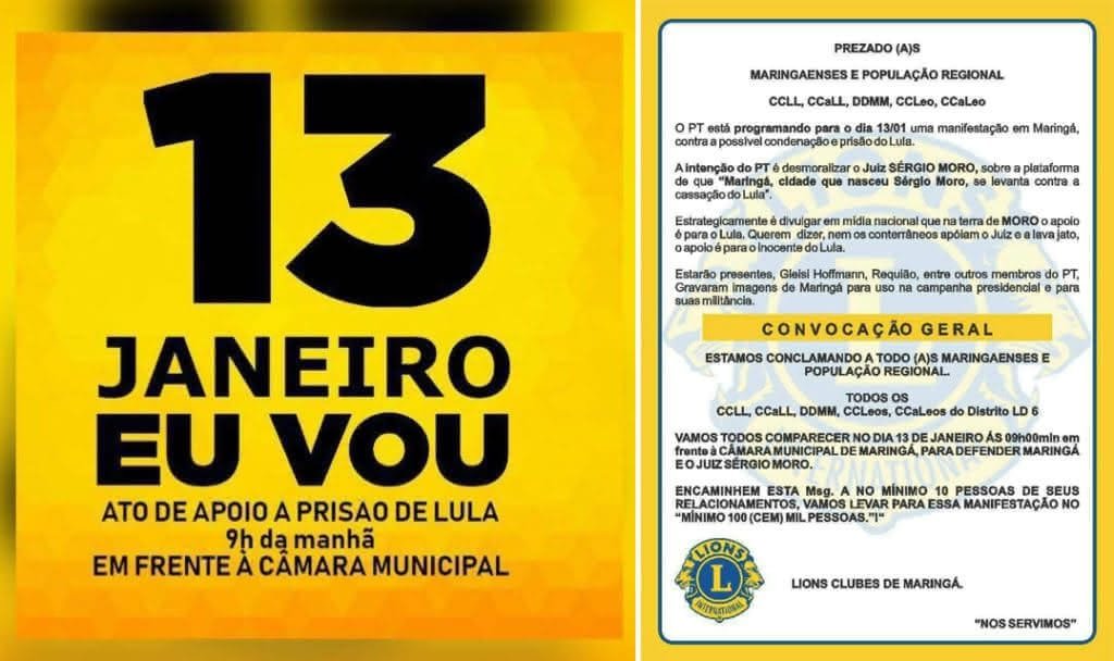 Um convite supostamente assinado pelos Lions Clubes de Maringá circulou hoje em redes sociais convocando maringaenses e população da região para o ato em favor da prisão do ex-presidente Lula, programado com apoio de pessoas ligadas ao grupo Patriotas e MBL locais, como resposta ao lançamento de um comitê pró-Lula, na manhã do próximo sábado, na câmara municipal.