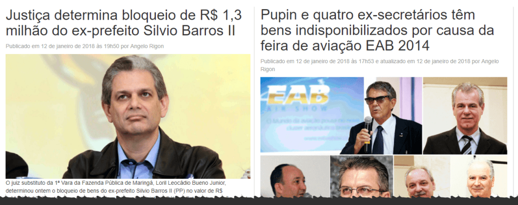Ações civis públicas movidas pelo Ministério Público Estadual de Maringá contra os ex-prefeitos Silvio Barros II e Carlos Roberto Pupin (ambos do PP), além de quatro ex-secretários municipais, tramitam há 34 e 46 dias, respectivamente, na 1ª e 2ª varas da Fazenda Pública da comarca. Nos dois casos, os ex-prefeitos tiveram bens bloqueados pela justiça. Ambos são acusados de improbidade administrativa e de terem causado dano ao erário durante seus mandatos.