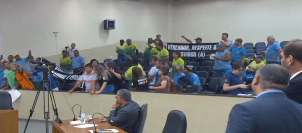 A galeria, formada por servidores da Semusp, gritava contra o vereador Homero Figueiredo Lima e Marchese, que alegou não poder concluir seu raciocínio.