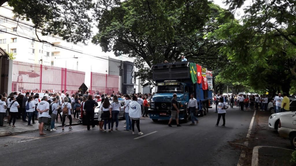 Um caminhão dos promotores do ato público está diante do escritório, na avenida prudente de Morais. Há cerca de 15 minutos viaturas da Polícia Militar acompanham o movimento. Três viaturas da Polícia Civil seguiram há pouco para o local.