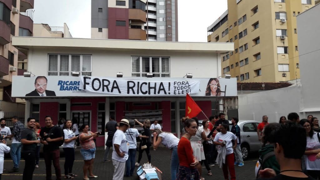 Além da faixa, manifestantes que tomaram o escritório político da família Barros colocaram um “xis” nos rostos do ministro da Saúde e da deputada estadual Maria Victória.