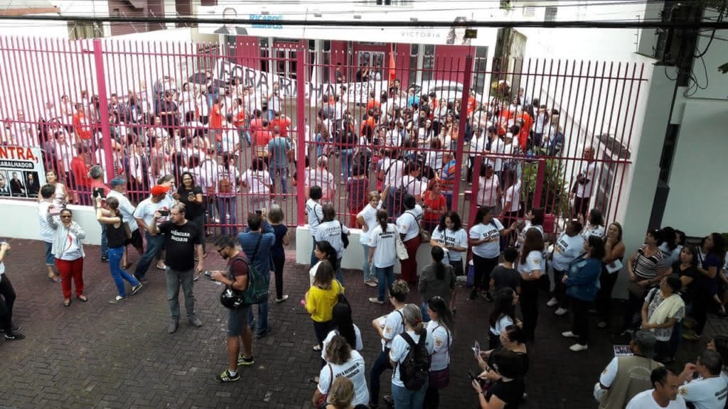 O protesto contra a reforma previdenciária estendeu-se até o escritório político do ministro da Saúde, deputado federal licenciado Ricardo Barros, e da deputada estadual Maria Victória, na avenida Prudente de Morais. O pessoal porta faixas e grita palavras de ordem contra o governo federal.