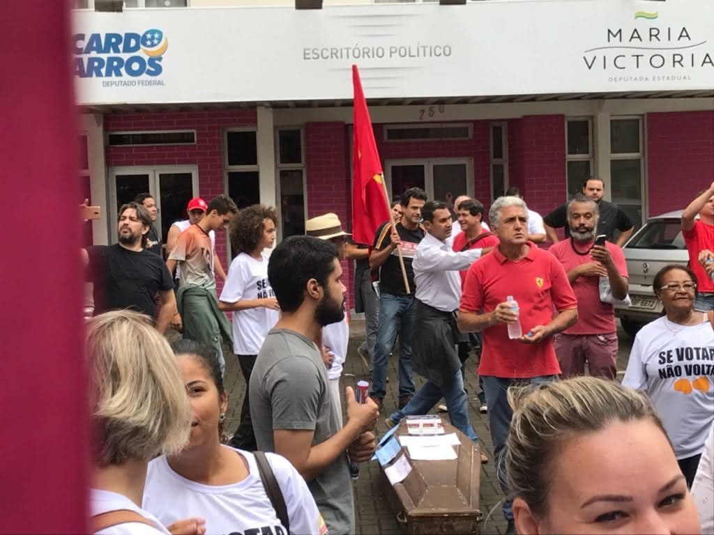 Policiais civis e militares seguiram armados para o escritório político da família Barros, cujo estacionamento foi invadido por manifestantes que protestam contra a reforma da previdência e o governo Michel Temer. Os manifestantes levaram um caixão para o local.