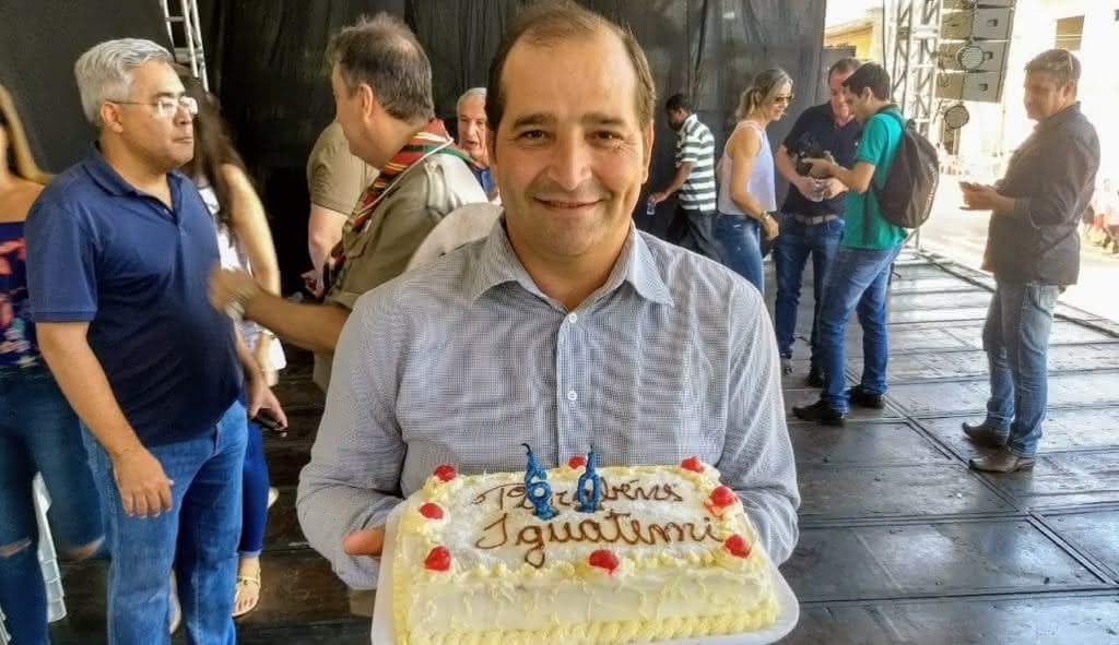 O vereador William Gentil posa com o bolo dos 60 anos do distrito de Iguatemi, que o acolheu há alguns e ajudou a elegê-lo.
