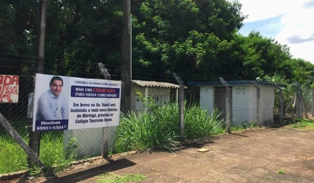 Na avenida Sophia Rasgulaeff, ontem a propaganda estava na mesma quadra, mas em local diferente (abaixo), em espaço cedido para a Sanepar.