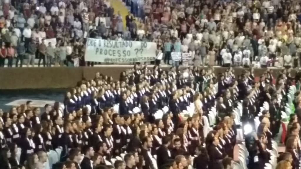 Uma faixa se destaca nesta noite, na solenidade de graduação da UEM no parque de exposições de Maringá, onde acontece a entrega de certificados de conclusão de 24 cursos a mais 721 formandos.