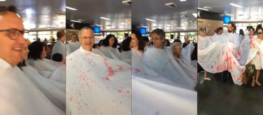Além do reitor da UEM, o vice-reitor Julio Damasceno, com outros professores, utilizaram um grande lençol com aberturas e marcado com tinta vermelha, para representar que a Universidade Estadual de Maringá sangrava.