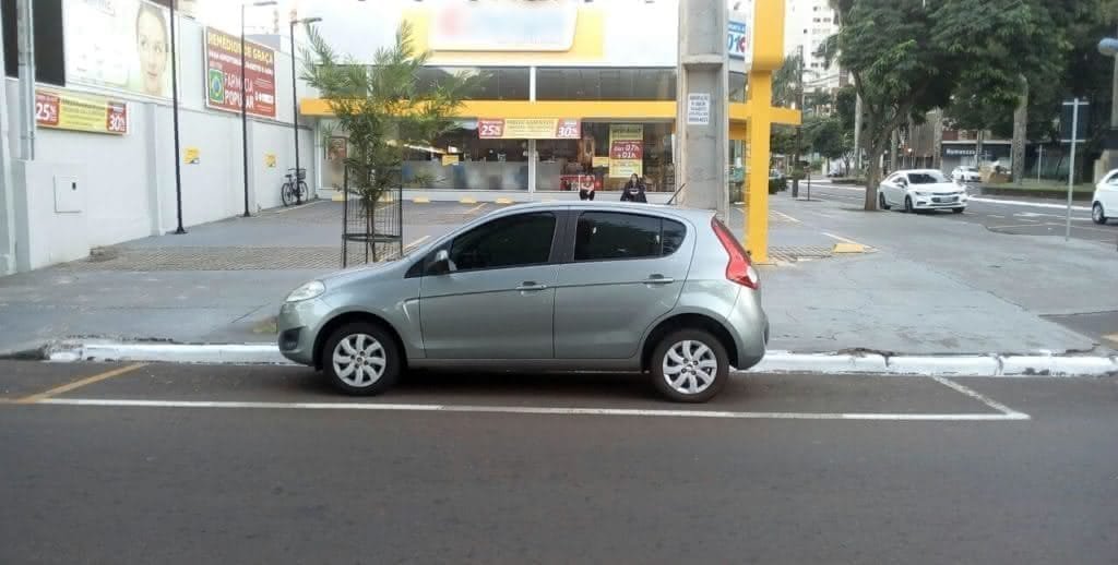 Leitor envia a foto do automóvel mal estacionado na avenida Tiradentes, próximo à avenida Paraná, e comenta que, como em Maringá sobram vagas de estacionamento, então motoristas podem se dar ao luxo de ocupar duas vagas com apenas um carro.