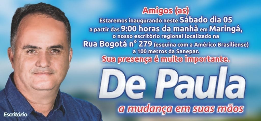 De Paula inaugura escritório Angelo Rigon 8 anos atrás Ex-prefeito de Sarandi e pré-candidato a deputado estadual pelo PP, Carlos Alberto de Paula Junior envia aos amigos convite para a inauguração de seu escritório, no Jardim Alvorada, na manhã do próximo sábado.