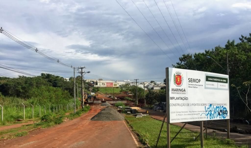 A construção das pontes na avenida Alexandre Rasgulaeff, para eliminar alagamentos no ponto de travessia sobre o córrego Mandacaru, zona norte de Maringá, segue em conjunto com a duplicação da avenida Alício Campolina, que está recebendo sinalização.