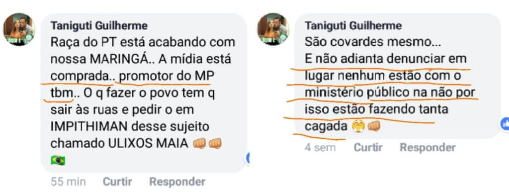Ele tem feito, agora, acusações envolvendo o Ministério Público, que estaria “na mão” do prefeito Ulisses Maia, que também teria o controle da mídia da cidade, embora, passados 18 meses de sua posse, sequer a concorrência para veiculação de publicidade tenha sido concluída. “A midia está comprada.. promotor do MP tbm”, escreveu Taniguti, que costuma se referir ao prefeito como “Ulixos Maia”.
