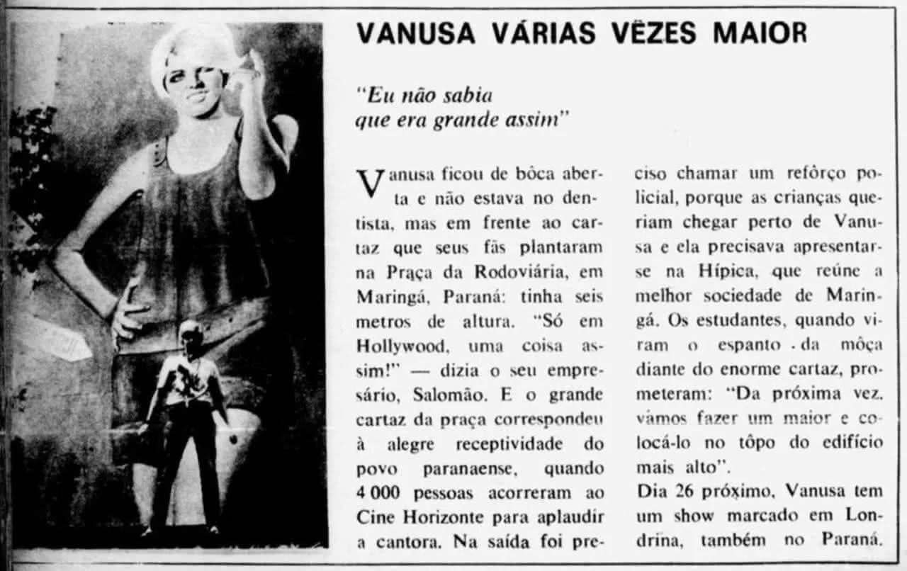 Na página 44 da revista Intervalo, abril de 1969, a notícia de um cartaz gigante (6 metros de altura) da cantora Vanusa na praça Raposo Tavares, em Maringá. Do acervo de JC Cecílio.