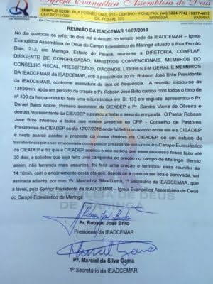 A proposta entre as duas partes aconteceu na terça-feira passada. Havia uma expectativa de que o secretário da Cieadep, pastor Daniel Sales Acioli, assumisse interinamente o cargo de Brito, acusado de ser o responsável pela dilapidação do patrimônio da igreja. Acioli e o pastor Sandro Vieira de Oliveira, além de outros representantes da convenção, estavam presentes, mas quem assumiu o cargo foi o vice-presidente da Ieadcemar, pastor Francisco Rodrigues. A informação, porém, não consta da ata da reunião. Para alguns, como Danilo Nascimento, trata-se de uma manobra que poderá resultar na permanência de Robson Brito à frente do campo eclesiástico. Pastor Francisco é considerado seu braço direito na diretoria da igreja. Robson José Brito está no comando da Ieadcemar desde 2005. A crise na igreja, que teve templos colocados em leilão, fez as ofertas caírem até 80%.