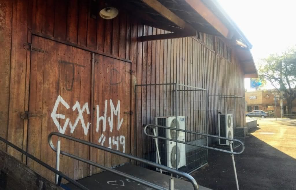 O prédio de madeira do Teatro Barracão da praça Todos os Santos, na Zona 2, em Maringá, não escapou das pichações.