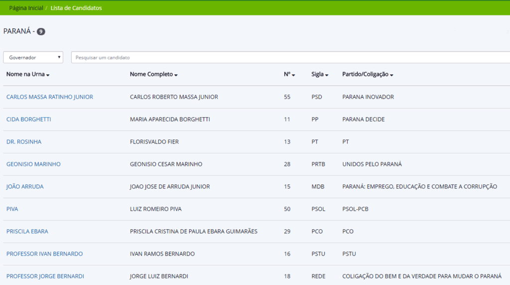 No segundo dia depois do prazo final para o pedido de registro de candidaturas junto à Justiça Eleitoral, o site do Tribunal Regional Eleitoral do Paraná relaciona nove candidatos ao governo do estado. Ogier Buchi, do PRP, não consta dela.