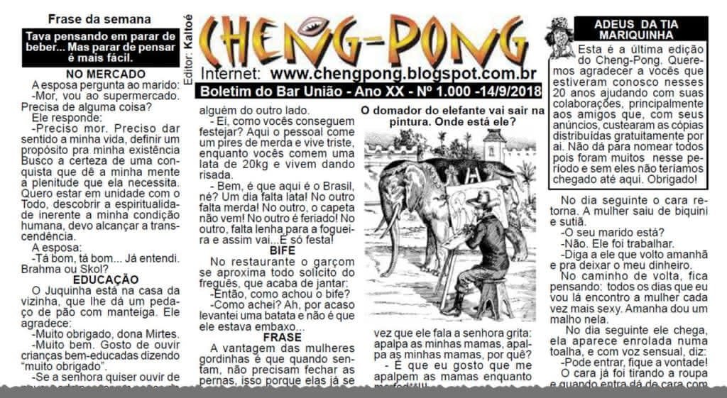 “Amigos, desde 28/2/1999 quando começamos o Chen-Pong já foram quase 20 anos. Por isso o Cheng estará se aposentando neste número 1.000. Nada mais justo, após circular semanalmente trazendo um pouco de bom humor aos amigos do Bar União e depois para inúmeros outros parceiros, gratuitamente, nesses anos todos, que aposentar.