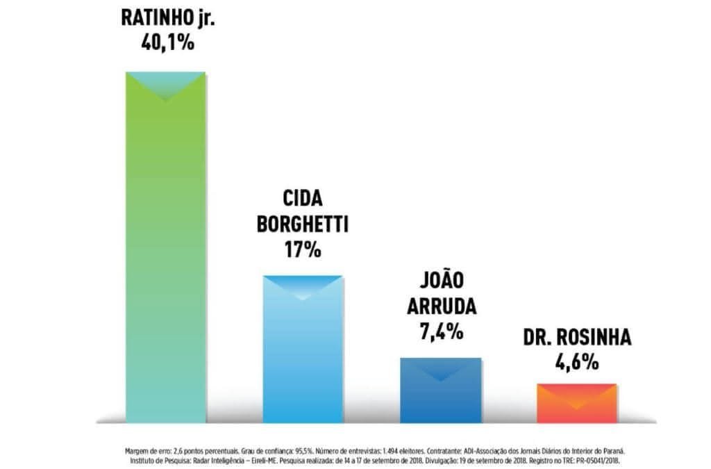 No levantamento, encomendado pela Associação dos Jornais Diários do Interior do Paraná, Ratinho Junior aparece com 40,1% na pesquisa estimulada. A soma de todos os outros candidatos é de 31,6%. Os eleitores indecisos representam 16,5% e os votos brancos e nulos 11,0%