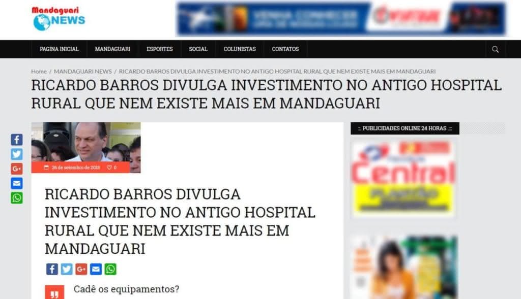 A propaganda de Ricardo Barros informando ter equipado um hospital que não existe mais desde 2015, em Mandaguari, micro-região de Maringá, virou piada entre os eleitores.