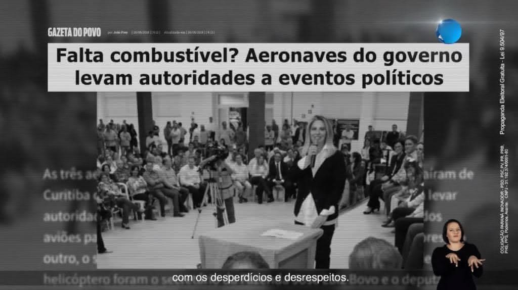 Ao fazer um resumo de suas metas, uma notícia da Gazeta do Povo sobre o uso indevido de aeronaves do governo a eventos políticos de Cida ilustrou a disposição do candidato do PSD de acabar com “as mordomias, desperdícios e desrespeito”.