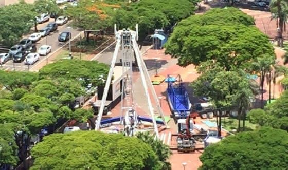 Iniciada ontem, prossegue a montagem da roda-gigante de 32 metros de altura colocada no Centro de Convivência Comunitária Renato Celidônio, e que a partir de sábado estará funcionando dentro do Natal Maringá EnCantada.