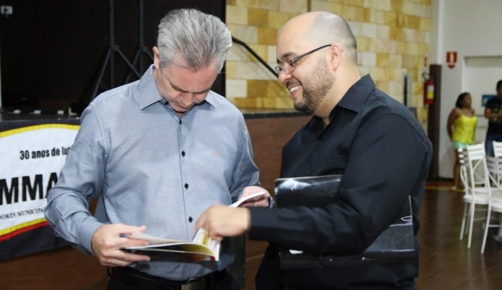 O prefeito Ulisses Maia folheia o livro “Sismmar, 30 Anos de Luta” (Sinergia Casa Editorial, 98 pág.), ao lado do jornalista e escritor Luiz Fernando Cardoso.