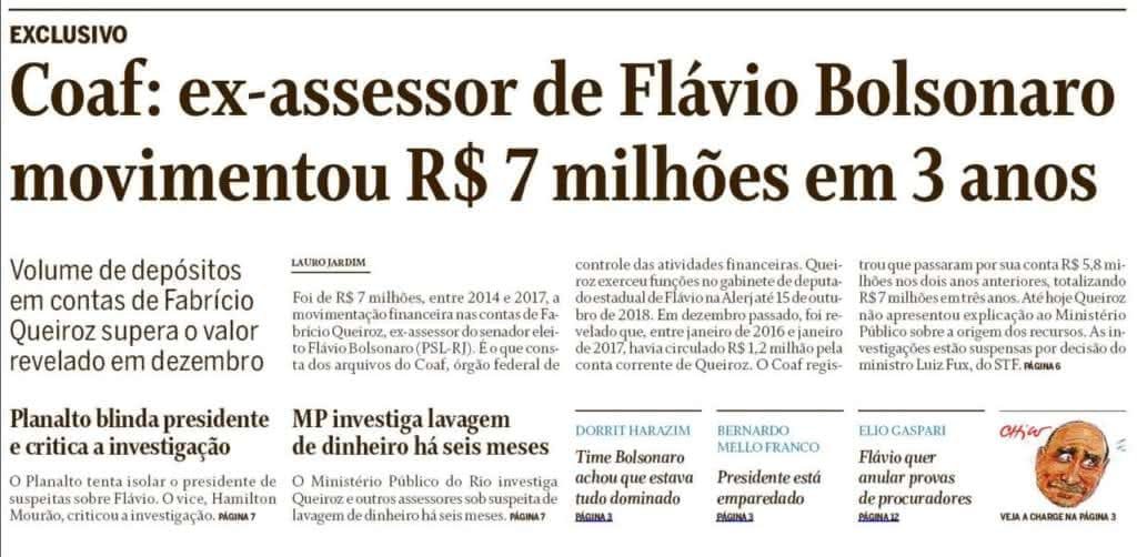 A informação de que Fabrício Queiroz movimentou R$ 7 milhões em três anos é de Lauro Jardim e é a manchete deste domingo do jornal O Globo.