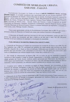 Aproveitando a passagem de Ratinho Junior por Maringá, a Comissão de Mobilidade Urbana de Sarandi entregou um documento ao governador pedindo solução para a questão dos cruzamentos na BR-376. A carta foi entregue com a presença do arcebispo dom Anuar Battisti.
