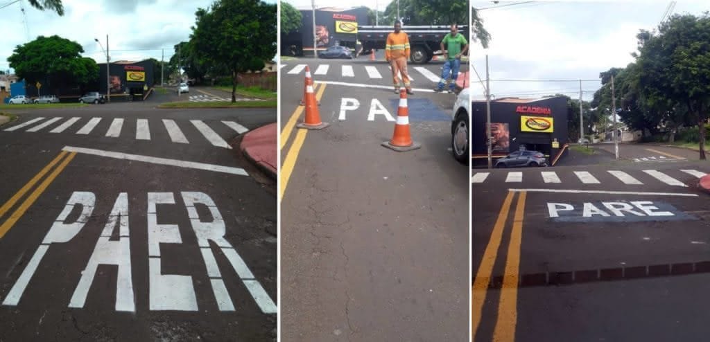 Uma empresa terceirizada que presta serviços de sinalização para a Secretaria de Mobilidade Urbana de Maringá errou ao escrever “Pare”, na madrugada de hoje, na avenida Guaiapó com a rua Rio Iguaçu.
