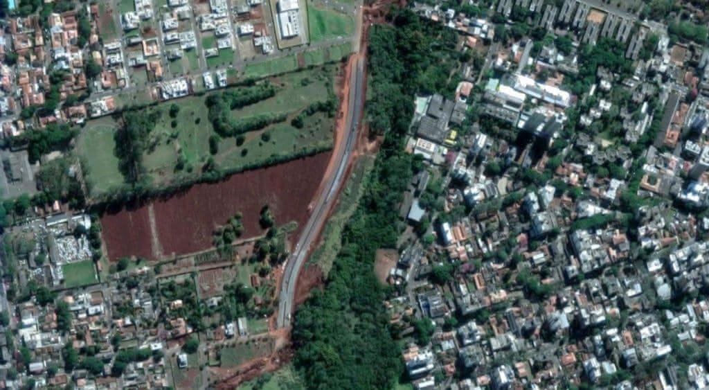 Acima, foto disponibilizada no Google Maps, mostrando as obras em andamento naquele local. Futuramente a rua será estendida até a avenida Colombo.