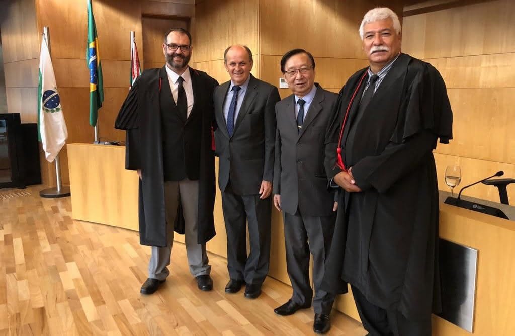 Ontem, em Curitiba, na posse de Maurício Kalache como procurador de justiça: o empossado ao lado do deputado estadual Dr. Batista, que representou a Assembleia Legislativa, o vereador Mário Hossokawa, que representou o Legislativo maringaense, e o procurador José Aparecido da Cruz, que fez a saudação ao colega.