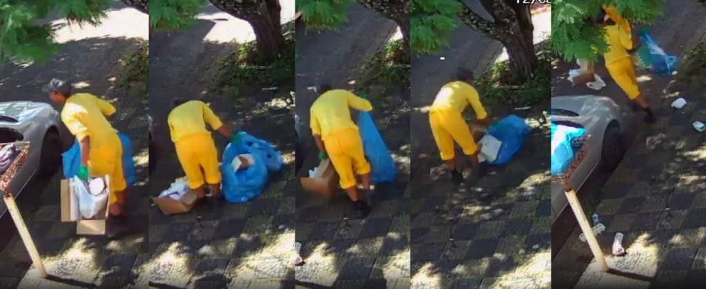 A sequência acima é de câmera de segurança. “Não era para reciclar tudo? Veja como o lixo fica espalhado”.