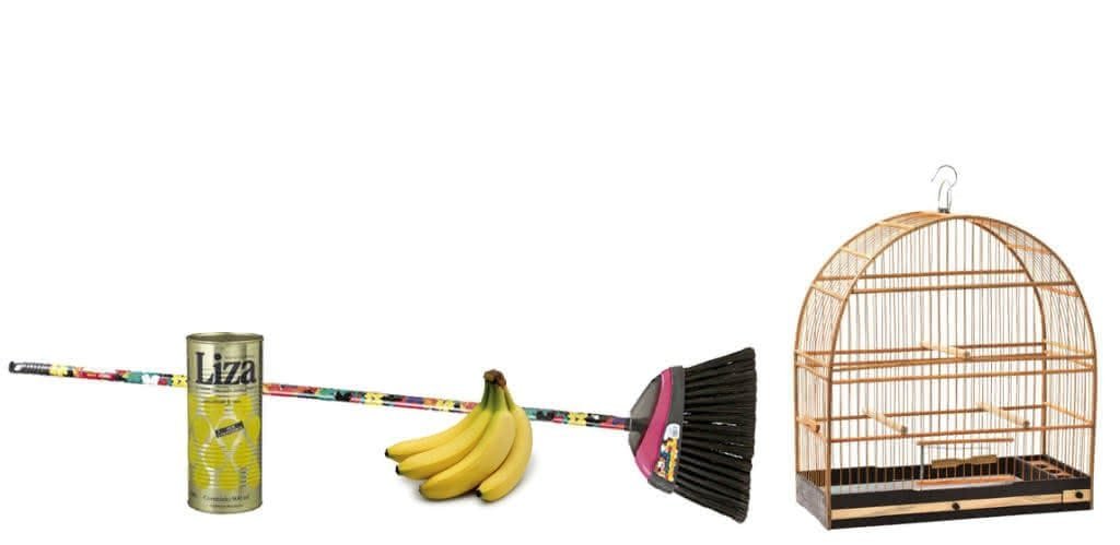 O freguês entra num armazém e pede seis bananas, uma lata de óleo, uma gaiola e uma vassoura.