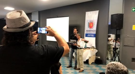 A partir de amanhã, no CAC (avenida Paraná, próximo à Brasil), além da exposição passa a exibir filmes escolhidos por Morimassa Miyazato (saiba mais). Abaixo, a placa que o homenageado recebeu do secretário de Cultura, fotografados por Vital Ben Waisermman.
