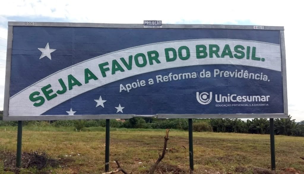 A Frente Brasil Popular divulgou nota repudiando a campanha publicitária do centro universitário Unicesumar em favor da reforma da Previdência, “que prejudicará a vida dos trabalhadores e professores que terão que contribuir mais, se aposentar mais tarde e receber um valor de aposentadoria menor no futuro”.