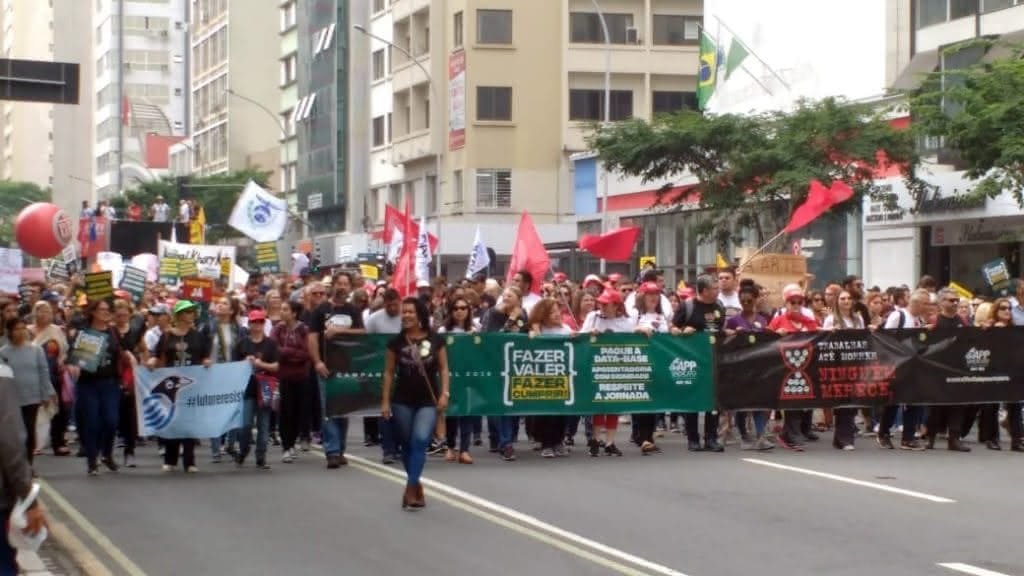 Servidores estaduais deixaram a praça Santos Andrade em direção ao Centro Cívico, onde se encontram lideranças de vários sindicatos, que aguardam reunião com representantes do governo do estado.