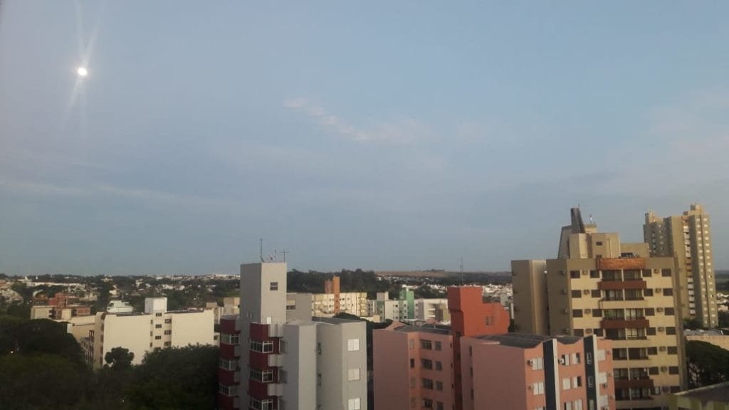 O dia em Maringá Angelo Rigon 7 anos atrás Quinta-feira com tempo parcialmente nublado, temperatura variando de 11 °C a 23 °C, 5% de probabilidade de chuva e pôr do sol às 17h59.