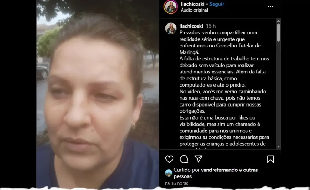 A conselheira tutelar Lia Chicoski publicou um desabafo ontem no Instagram. Estava debaixo de chuva e expôs: ampliaram o número de conselheiros do CT mas não há estrutura, como a falta de carros e motoristas.