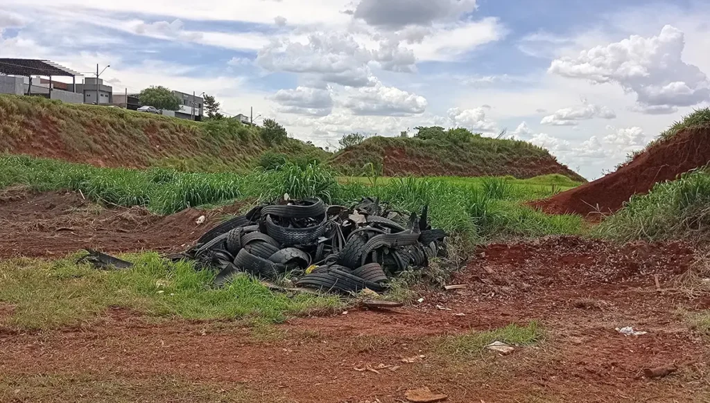 Retiraram os entulhos, conta o leitor, mas o mais preocupante é que deixaram lá são os pneus, que são criadouros do mosquito da dengue.