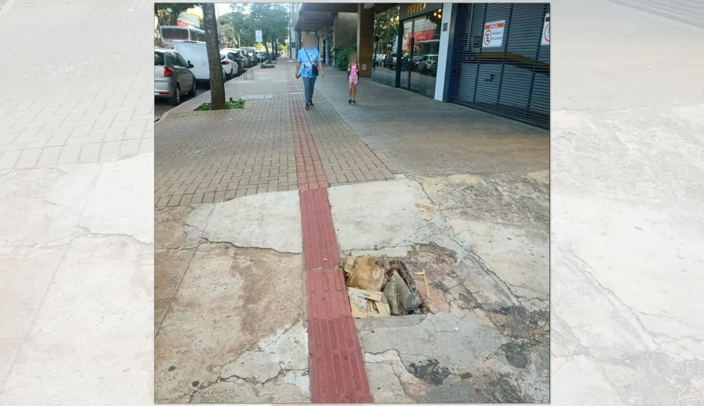 A prova de hoje nas Olimpiadas sem acento no “i”: desvio de buracos na calçada. Para os desatentos, este passeio termina no hospital. Rua Tamandaré quase esquina com avenida São Paulo, região central de Maringá. Foto de Andre Leandro Veneruci.