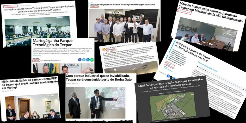 Parque tecnológico de Maringá, que deveria estar pronto em 2016 (acima, alguns recortes da mesma notícia, em anos diferentesz) ainda não virou mas voltou a ser notícia no final de semana; mais uma promessa de alguns que sobrevivem (bem) da política maringaense