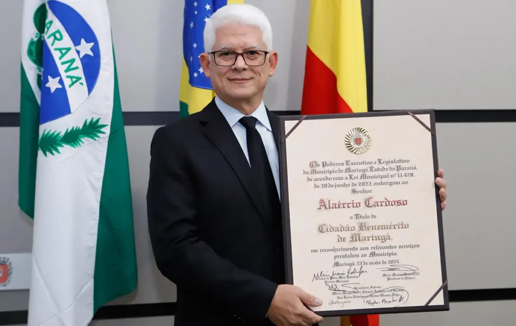 O professor Alaércio Cardoso recebeu ontem à noite o título de cidadania benemérita de Maringá. Na chamada super quinta-feira, a galeria da Câmara Municipal lotou.