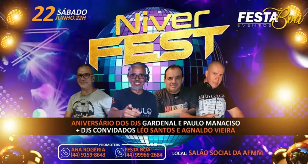 Neste sábado, 22, a partir das 22 horas acontece a primeira edição da Niver Fest na Associação dos Funcionários Municipais de Maringá (AFMM, avenida Morangueira 3320, Jardim Alvorada) com muita música dos anos 80 e 90.