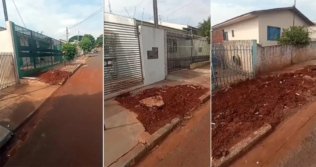Na rua Ramom Carrasco, Parque Alvamar, em Sarandi, moradores aguardam a prefeitura refazer o passeio público. Por conta de um vazamento de água, a calçada foi arrebentada em ao menos 5 lugares; a demora deixa o pessoal revoltado.