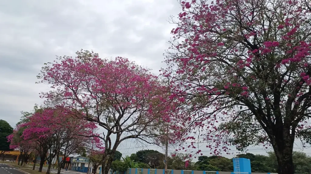 Árvores no canteiro central da avenida das Grevíleas.