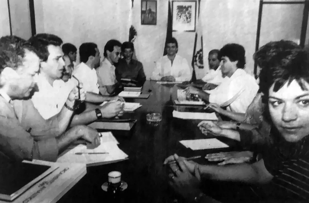 Registro feito por João Mantovan (do extinto O Estado do Paraná) da primeira reunião de secretariado do então prefeito Ricardo Barros, em janeiro de 1989. O primeiro à esq. é Edmundo Albuquerque, secretário de Comunicação, hoje pré-candidato a vereador pelo PP.